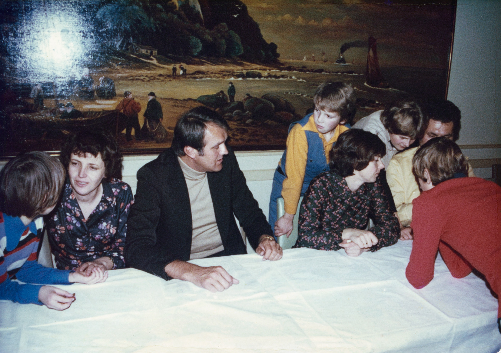 The inn still exists today. There’s now a pool table in this room, and the painting is tainted yellow from years and years of cigarette smoke. I just love everything about this picture. The gestures of my grandmother and her niece, holding each other’s hands. My uncle clad in blue and yellow, clutching the back of the chair and looking at his “uncle from the West.” And then there is my mother, glancing over her aunt and uncle’s shoulder at something we’ll never see. Assuming that my grandfather took this stunningly well composed picture, it’s all about family relations, composition, and playing roles, and that’s why the “Erbgericht” has been my muse until today. It relates to the now and to the past, because my cousin looks a lot like his father in this picture, and I have a similar profile like my mother, grandmother, and her twin sister.