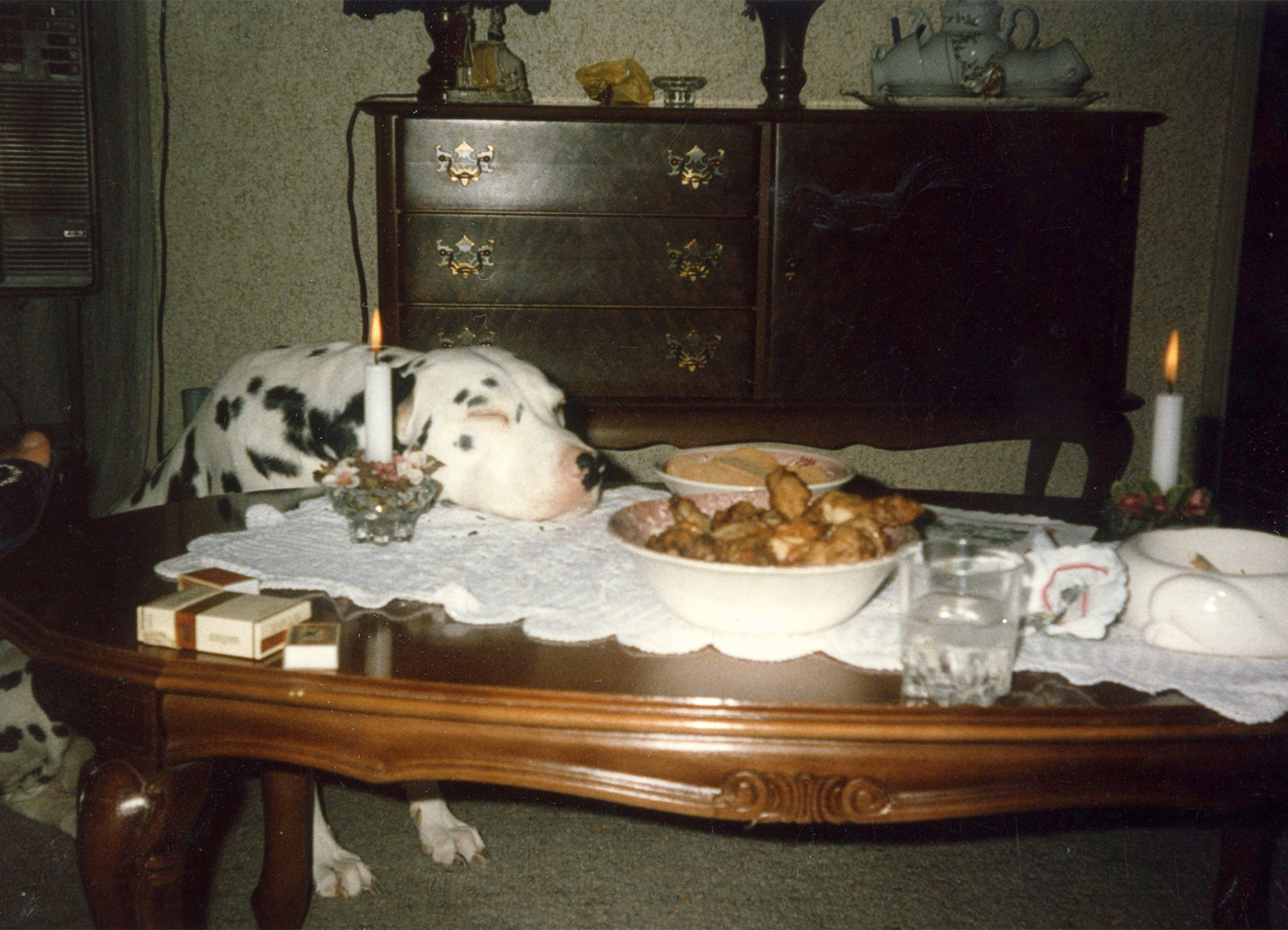 This image pretty much sums up my childhood. This picture must have been taken around 1985. You see Ascot, our Dalmatian, a pack of Barclay cigarettes, two boxes of matches, snacks and a brown faux chic interior. Ascot was my best friend at that time. He would spoon with me in bed, follow me around the house, and always go out to play with me. We had a small living room, and my parents were chainsmokers. The room was always blue from smoke. I really hated that. The dog would walk anxiously around the table when there was food on it. He followed every single move I made diligently. After a while he’d get tired and sit down next to the table. He would then fall asleep the way you can see in this image.