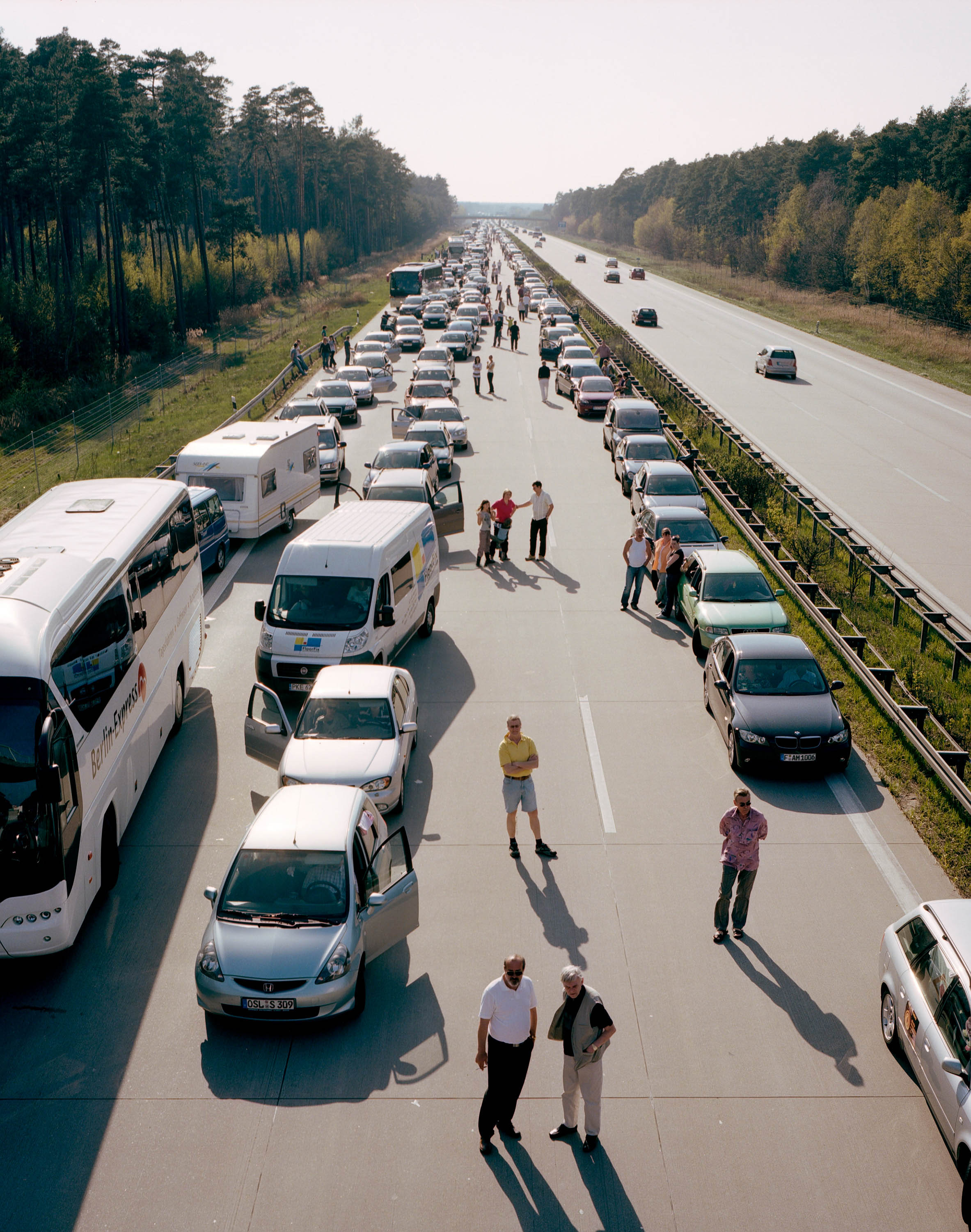 I was on my way back to Berlin with a friend of mine when we got into a full closure of the Autobahn. I climbed a bridge going over the road and took this picture. Full closures are absurd. Complete strangers gather in a place where cars usually pass by at 180km/h and just stand around.