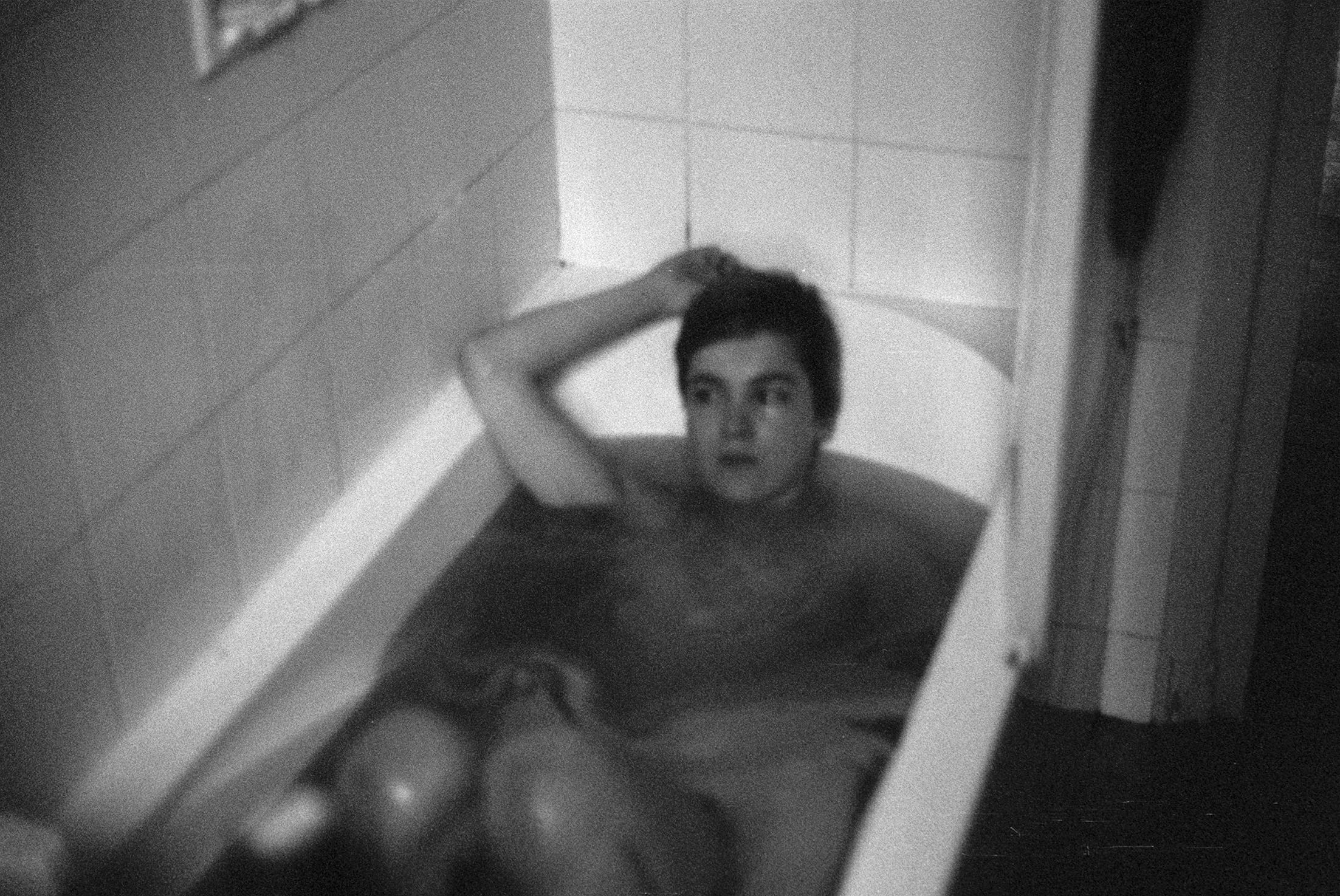 I coloured my hair blue, and my bath water turned blue as well. I asked my boyfriend to take a picture. It was an analogue camera, and we didn’t check what kind of film was in it. The picture ended up being black and white. No blue. But I, I was blue.